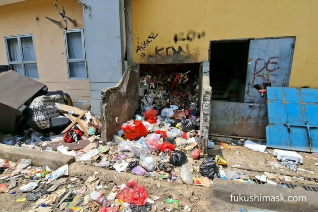 Situasi serupa terjadi di Rusun Angke, di mana penumpukan sampah menyebabkan dinding warung milik Masruroh (67) roboh. Menurut pengakuan Masruroh, air bercampur limbah dari tumpukan sampah meluber ke berbagai arah. Belatung juga menggerogoti area tersebut akibat sampah basah yang tak terkontrol. Puncaknya ketika sampah menumpuk hingga menyentuh atap warung, sehingga tembok tempatnya berdagang tak mampu menahan beban dan runtuh.